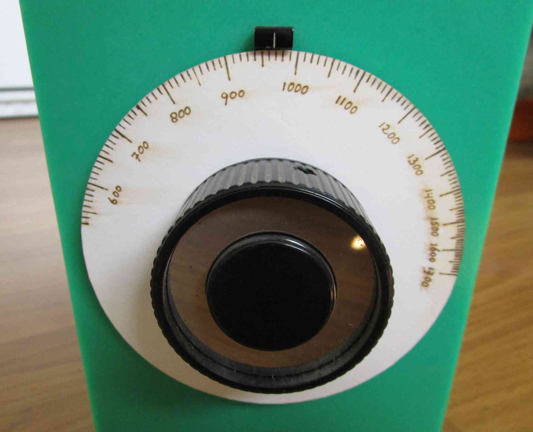 Afstemschaal van de detector unit. De frequentie is direct op de schaal af te lezen. Tussen de afstemknop en de afstemcondensator bevindt zich
