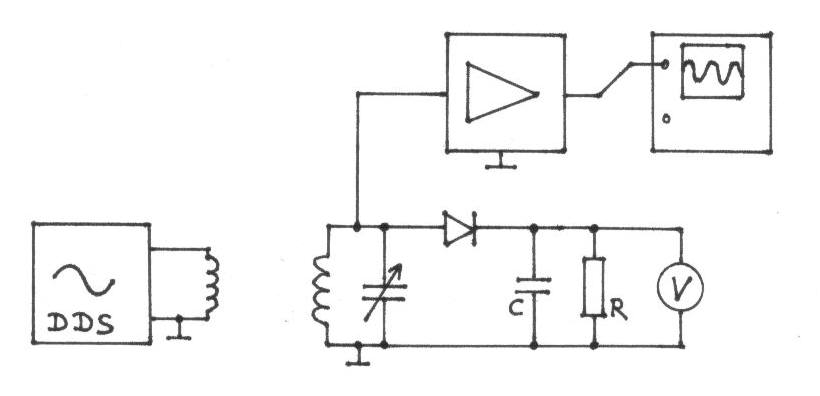 Meetopstelling gebruikt bij alle metingen op deze pagina. De oscilloscoop meet via de meetversterker de spanning over de LC kring. De voltmeter meet de gedetecteerde gelijkspanning. De belastingsweerstand wordt gevormd door weerstand R parallel aan de voltmeter met 10 MΩ ingangsweerstand. Condensator C heeft de waarde: 100 nF Het hoogfrequent signaal wordt geleverd door een DDS signaalgenerator, het signaal wordt via een koppelspoel aan de LC kring gekoppeld. |