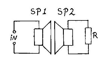 The sound of speaker 1 (SP1) goes to speaker 2 (SP2) wich works as a microphone,
