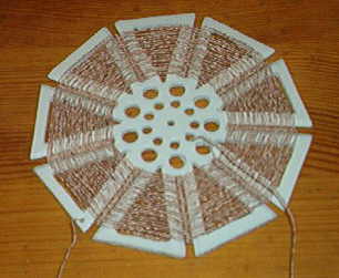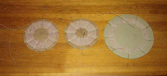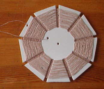 De spoelen zijn als spinnewebspoel gewikkeld op houders van golfkarton.