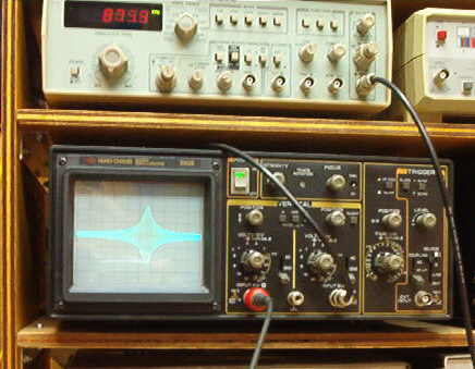 | Boven: sweep signaal generator. Onder: oscilloscoop met de curve van de LC kring op het scherm. |