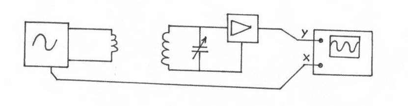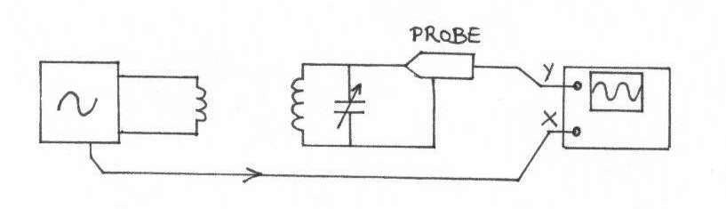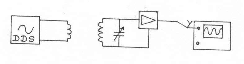 De signaal uitgang van de sweep generator verbinden we met de koppelspoel welke we op ongeveer 20 cm afstand van de spoel uit de LC kring houden.