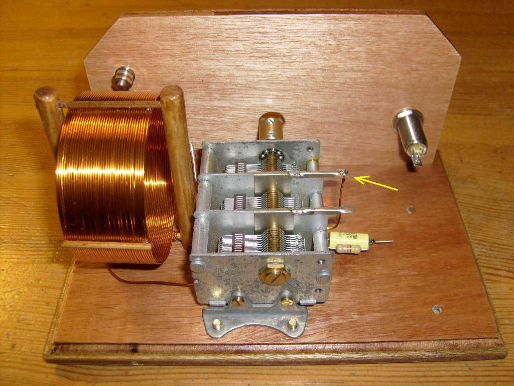 Één van de spoeldraden loopt onder de afstemcondensator door, wordt dan omhoog gebogen