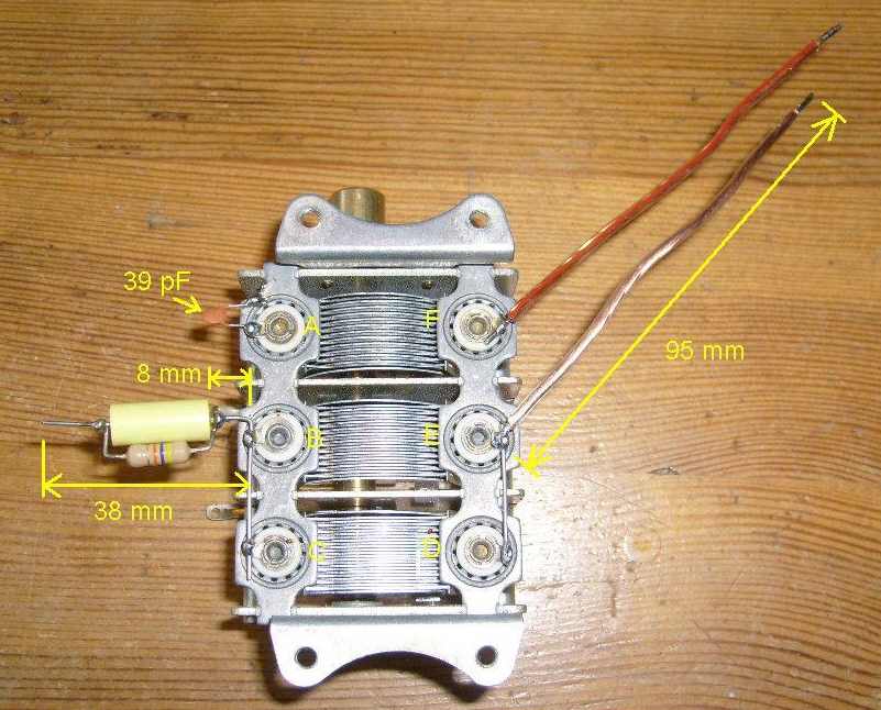 Soldeer het afgeknipte draadje tussen de punten D en E van de afstemcondensator.