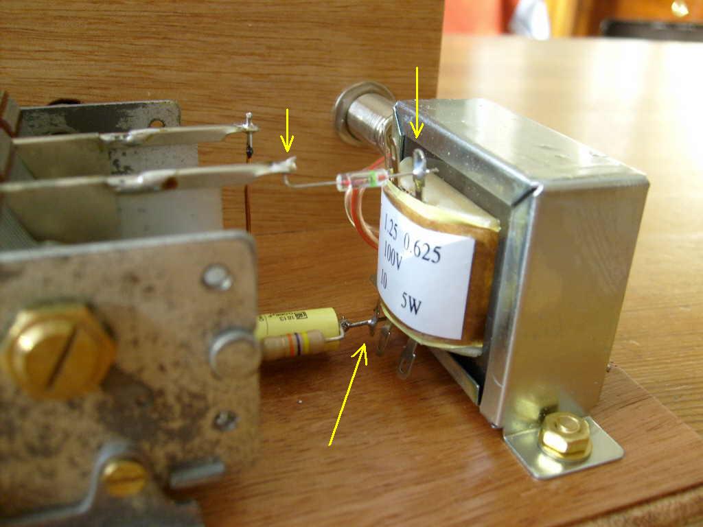 Soldeer deze draad aan de afstemcondensator (aangegeven met pijl op bovenstaande